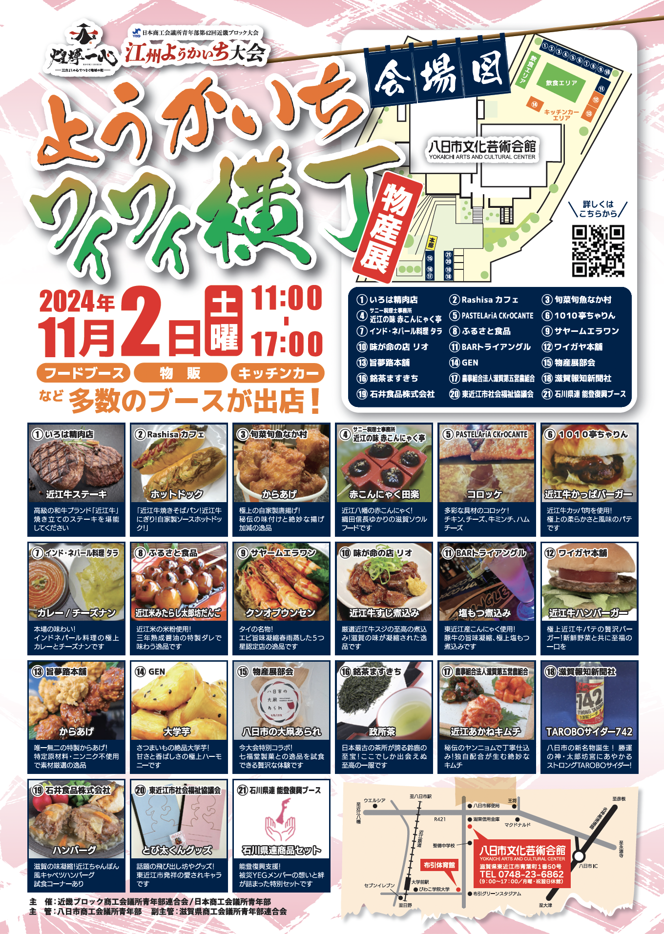 滋賀県八日市周辺の物産を集めた「八日市ワイワイ横町」を文化芸術館会場裏で開催いたします。